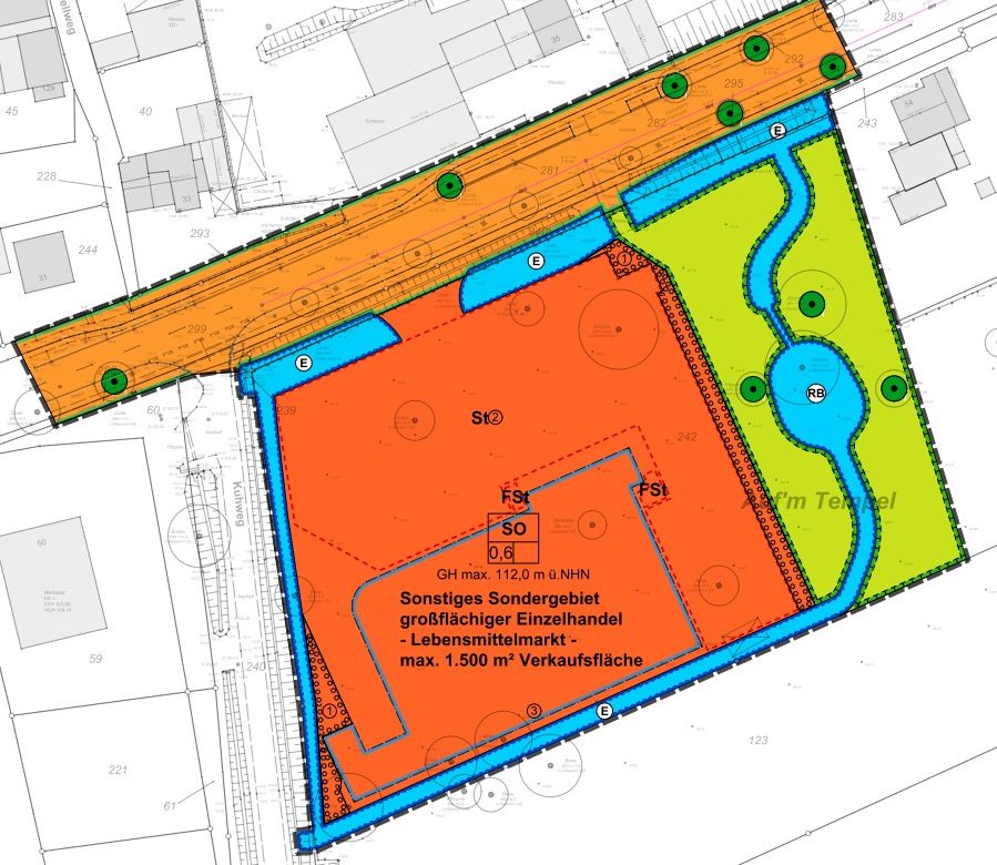 Im Stadtteil Büderich der Stadt Werl wurde durch einen vorhabenbezogenen Bebauungsplan auf einer bisher unbebauten Grünfläche das Planungsrecht für einen modernen, eingeschossigen Lebensmittelmarkt mit einer großzügigen Verkaufsfläche von 1.500 m² geschaffen. Dieser Markt wird an der vielbefahrenen Büdericher Bundesstraße, an der Ecke Kuhweg, errichtet und wird somit eine zentrale Anlaufstelle für die Versorgung des Stadtteils Büderich bieten.