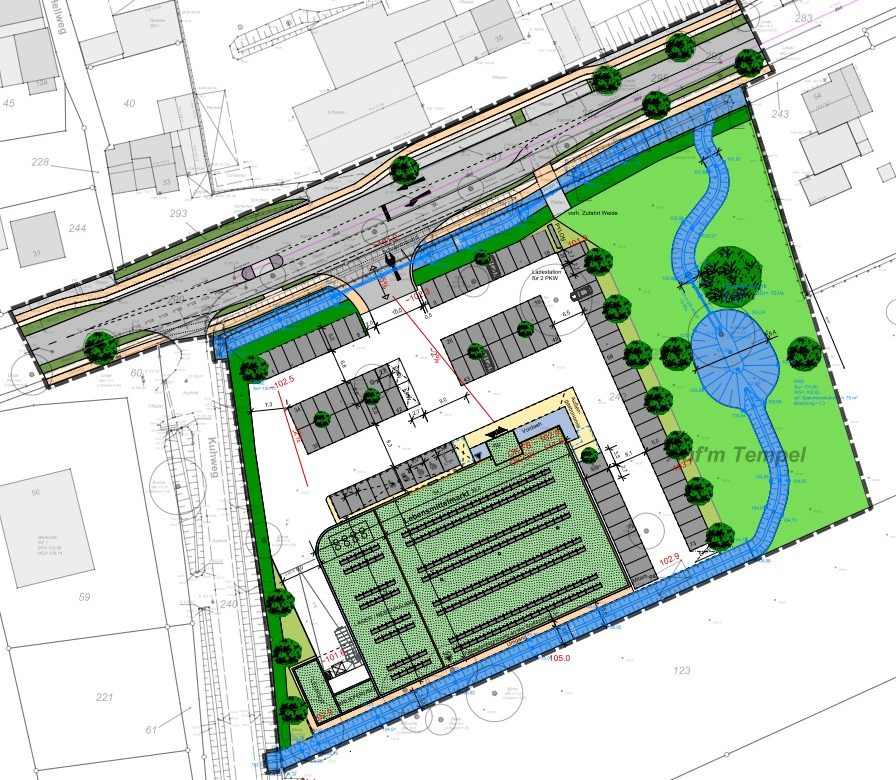 Die Planung des Gebiets umfasst im östlichen Bereich des Plangebietes zusätzlich ein naturnahes Rückhaltebecken. Dieses Becken dient der Regenwasserbewirtschaftung und ist durch Entwässerungsmulden in das Landschaftsbild integriert, wodurch der gesamte Bereich umweltfreundlich und nachhaltig gestaltet wird.